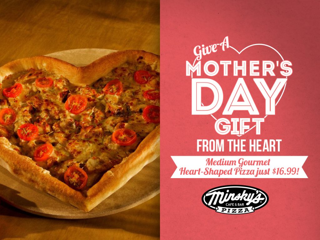 This Mother’s Day treat the special Mom in your life to a gift from the heart – Minsky’s Gourmet Heart-Shaped Pizzas! Available in Medium size only for just $16.99, ask…