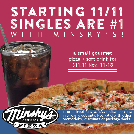 Being single definitely has its rewards - especially at Minsky's! Single in the city? This is your lucky week! It's International Singles Day, a celebration that starts around the world…