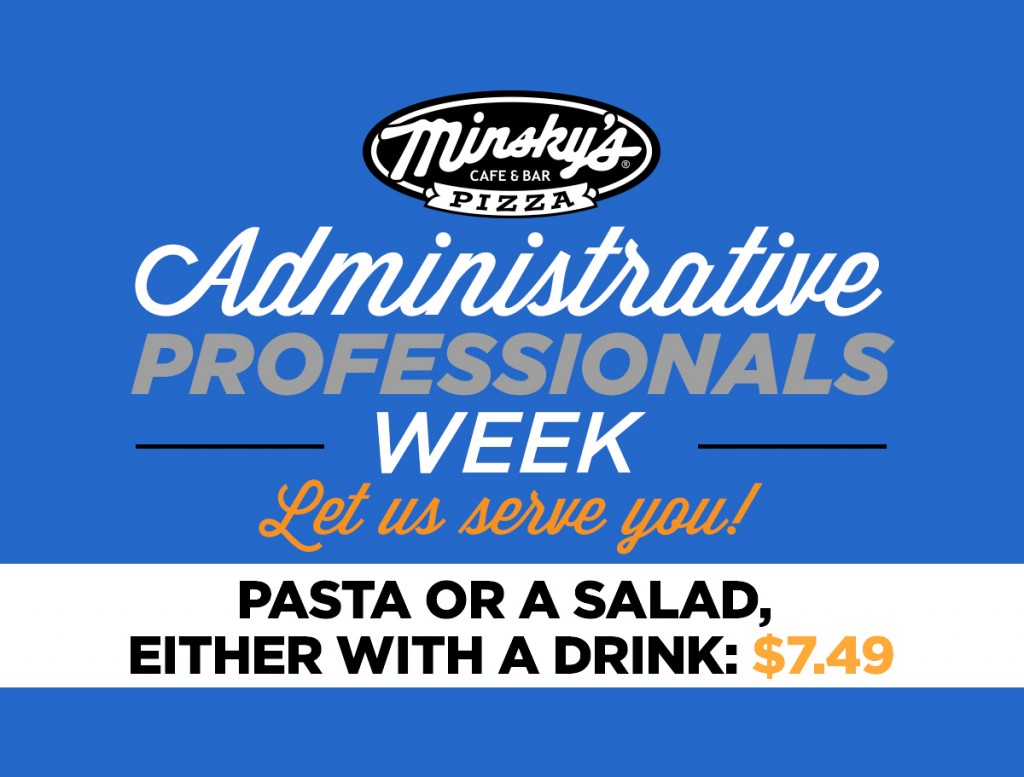 We're celebrating Administrative Professionals all week at Minsky's! Time to put the filing away, walk away from that non-stop ringing phone and relax - this week, we'll serve you! Come…
