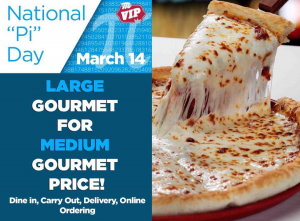 3/14 is Pi Day and here at Minsky’s we take any opportunity to celebrate our favorite “pi” – the pizza pie! In honor of Pi Day, get any Large Gourmet Pizza for the price of a Medium!