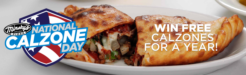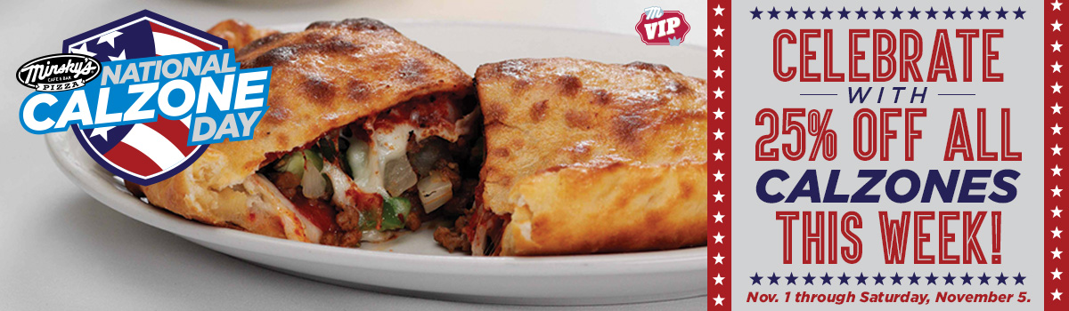 Discount available for Minsky’s VIP Members and also through online ordering. Valid Wednesday, November 1 through Sunday, November 5, 2017 at all participating Minsky’s locations. Not valid with other promotions, discounts, or package deals. Must surrender VIP coupon to receive discount or show your server discount VIP coupon on your mobile device. Valid for dine in, carry out or delivery. “Free Calzone Sweepstakes” Rules available at http://minskys.com/national-calzone-day/ When ordering online at Minskys.com, at checkout just enter promo code: Calzone25