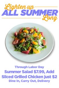 Summer is in full swing and, after a day in the heat, who doesn’t need a refreshing and light pick-me-up meal? Beat the heat this warm weather season with a big, fresh, (not to mention quite colorful!) Summer Salad, for just $7.99 – all summer long!
