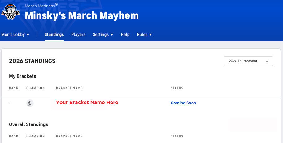 Now you’re all set until the NCAA Tournament brackets are released on Sunday evening, March 15, 2026! You will be sent a reminder by email to log back into the bracket page (minskysmarch.mayhem.cbssports.com) to make your picks!