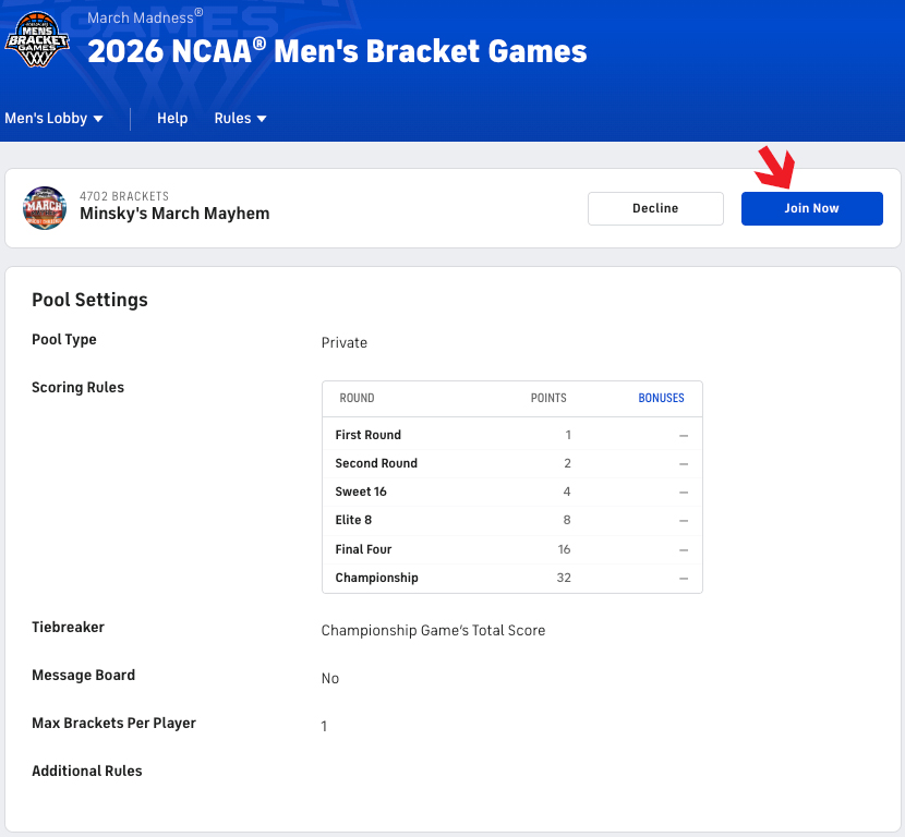 Join the group today, then log back in to your account to submit your tournament picks after the Official Brackets go live (after 6:00pm on Selection Sunday, March 15, 2026) and no later than the start of the first round of the tournament (Thursday, March 19, 2026 before 11AM CST).
