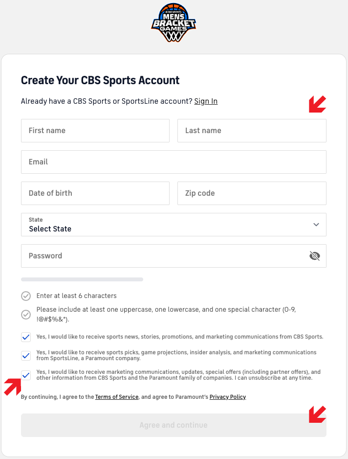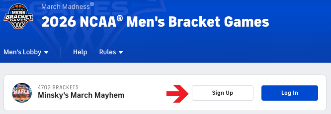 If you have participated in Minsky’s March Mayhem before, simply click the Minsky’s March Mayhem invite link in Step 1, sign in with your CBSSports.com ID (the email you originally signed up with) and Password, and then skip to Step 4 in the instructions below to join the Minsky’s March Mayhem group.