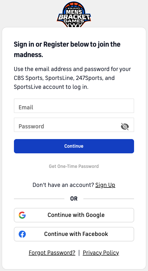 If you have participated in Minsky’s March Mayhem before, simply click the Minsky’s March Mayhem invite link in Step 1, sign in with your CBSSports.com ID (the email you originally signed up with) and Password, and then skip to Step 4 in the instructions below to join the Minsky’s March Mayhem group.