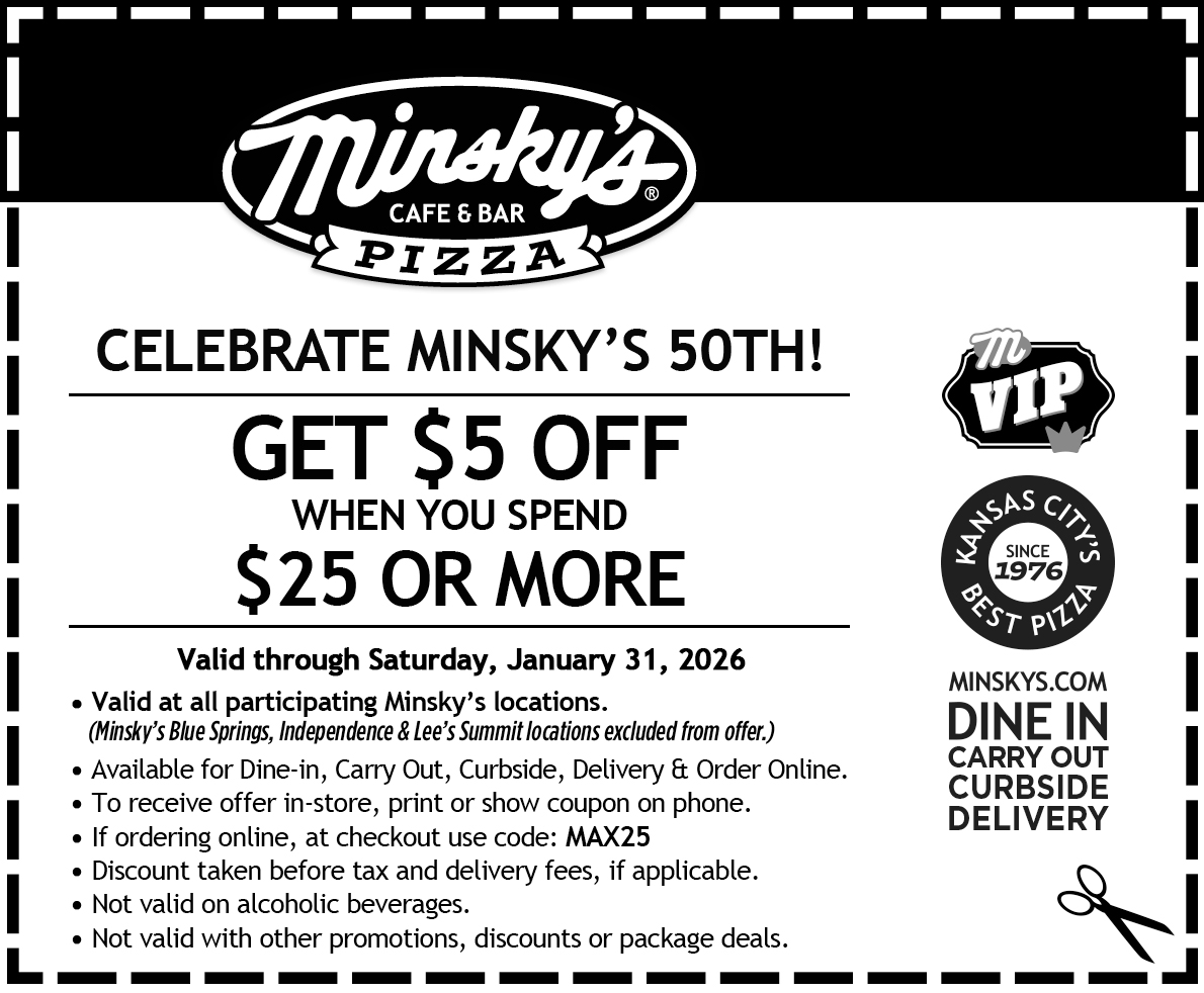 Offer valid through January 31, 2026. Excludes alcohol, discount taken before tax & delivery charge. Available for Dine-In, Carry Out, Delivery, or Order Online at participating Minsky’s locations – excludes Blue Springs, Independence, and Lee’s Summit locations. Offer not available on third-party online ordering platforms. Offer may not be combined with other promotions, discounts, or package deals.