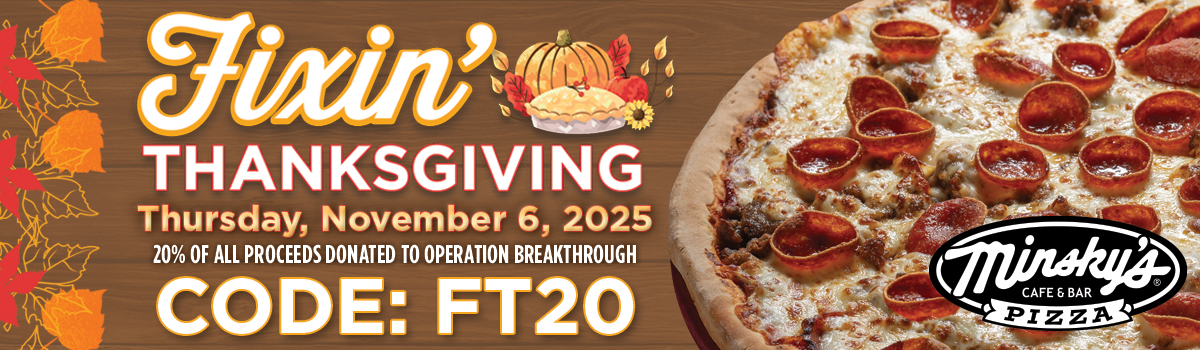 So, on Thursday, November 6, 2025 – enter code: FT20 when ordering online at Minskys.com or mention the code to your server when dining in (or show this promo on your mobile device) and 20% of net proceeds will be donated to Fixin’ Thanksgiving for Operation Breakthrough!