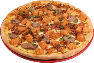 This German-inspired delicacy starts with your favorite Minsky’s crust painted with house-made Oktoberfest sauce crafted with KC Bier Co’s seasonal FESTBIER! Next, a mountain of Wisconsin Mozzarella cheese, white cheddar cheese curds, crispy tater tots, chopped bacon, fresh parsley, and the star of the show- a generous helping of KC Bier Co sliced bratwurst – Wunderbar!