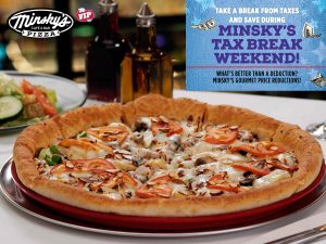 All caught up on your tax deductions? Sounds like the perfect time for a Minsky’s Pizza price reduction! This Saturday, April 13 through Tuesday, April 16, 2019 enjoy not one, but TWO Gourmet price reductions sure to make you – and your wallet – happy!