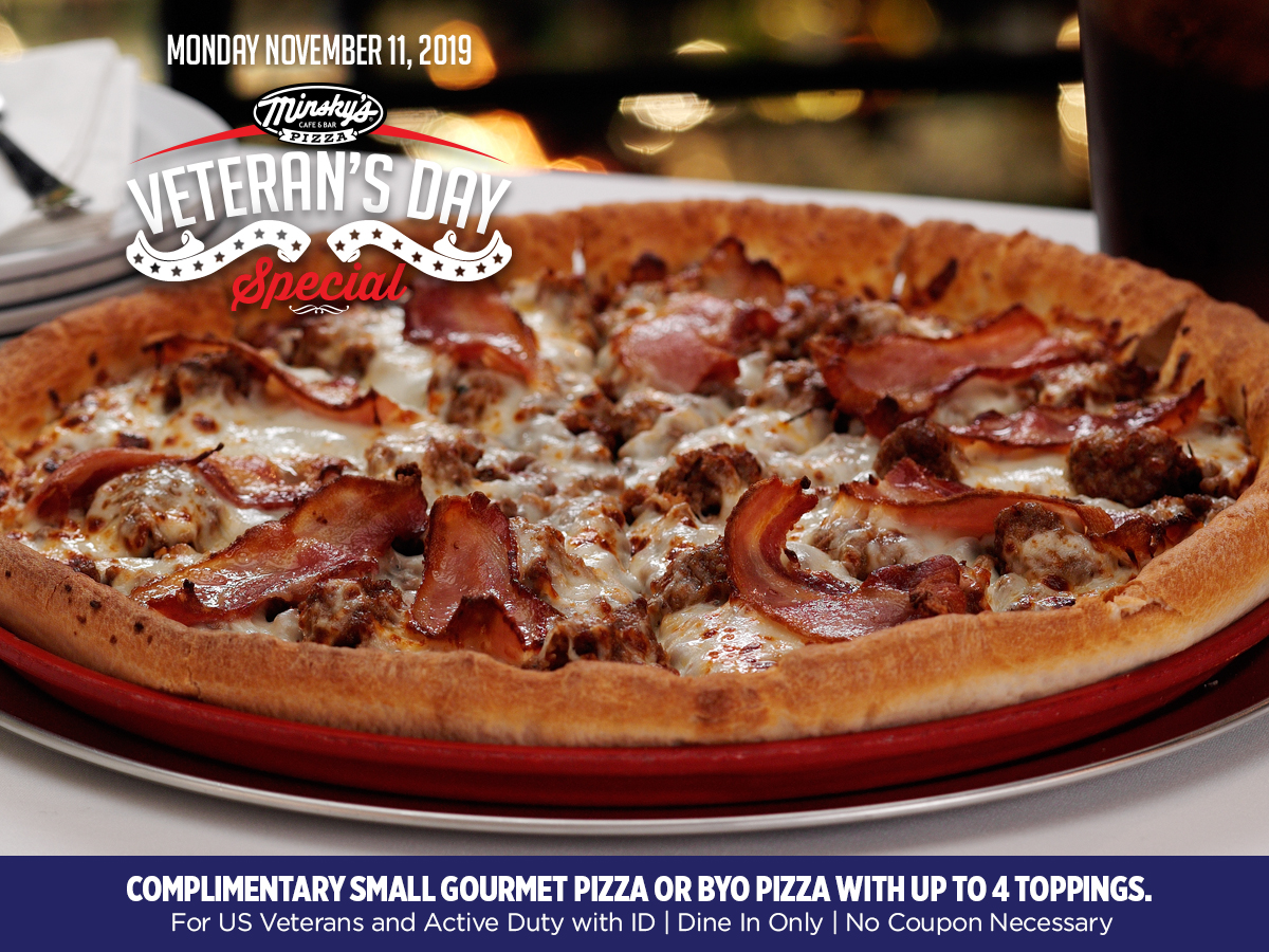On Monday, November 11, 2019, both Veterans and Active Duty service members can enjoy a complimentary Small Gourmet Pizza or Build Your Own Small Pizza with up to 4 toppings when you dine in at Minsky’s Pizza!